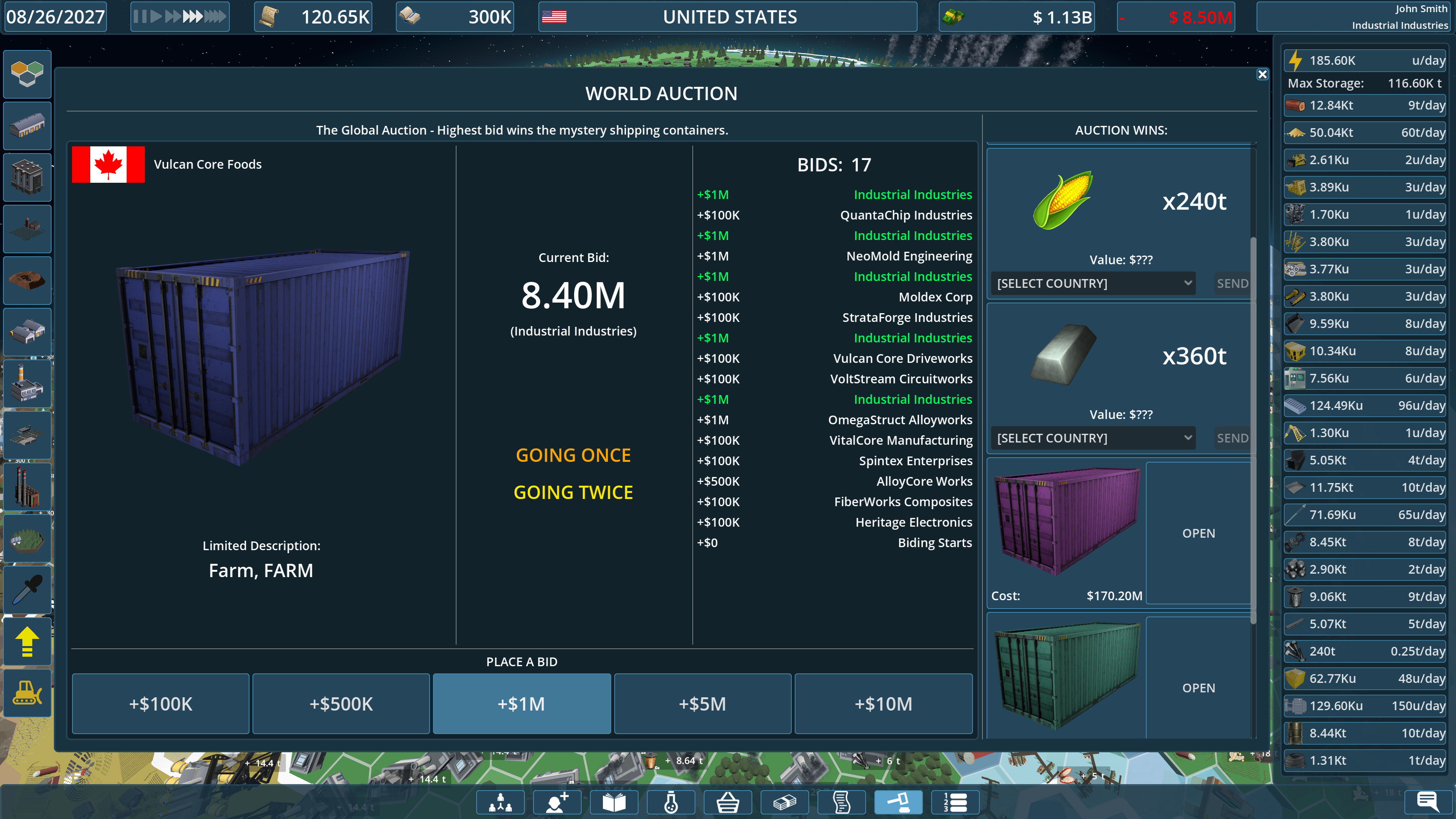 Factory Default is a management simulation game where you build a worldwide industrial conglomerate. You control the entire production chain: from mining raw ore and farming crops to refining complex materials and manufacturing high-tech goods.