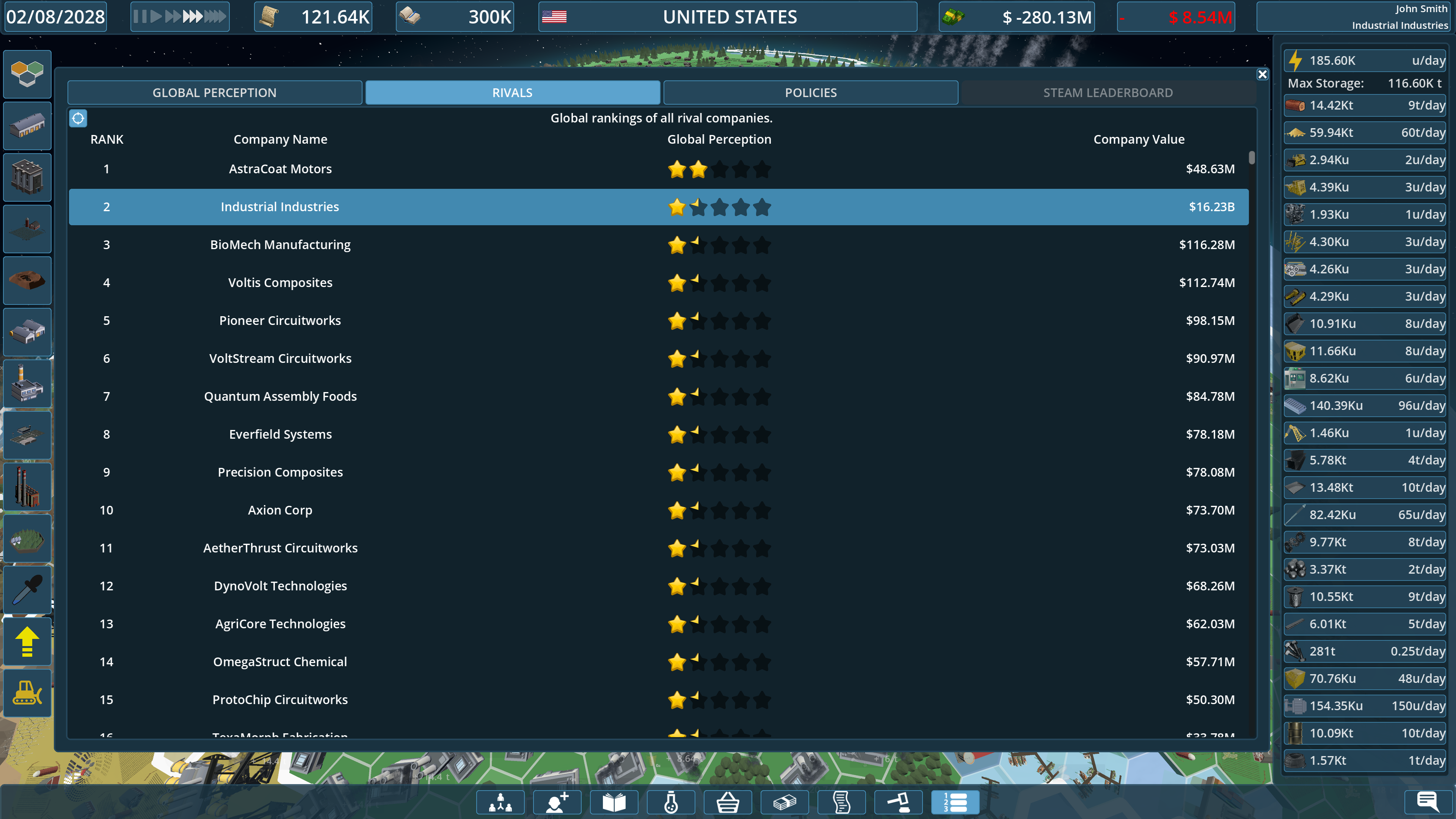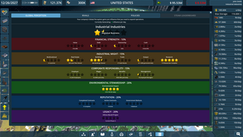 - GLOBAL PERCEPTION SYSTEM: A new 5-Star rating system that determines your Influence generation. You are judged on Financial Strength, Industrial Might, Corporate Responsibility, Environmental Stewardship, Reputation, and Legacy.