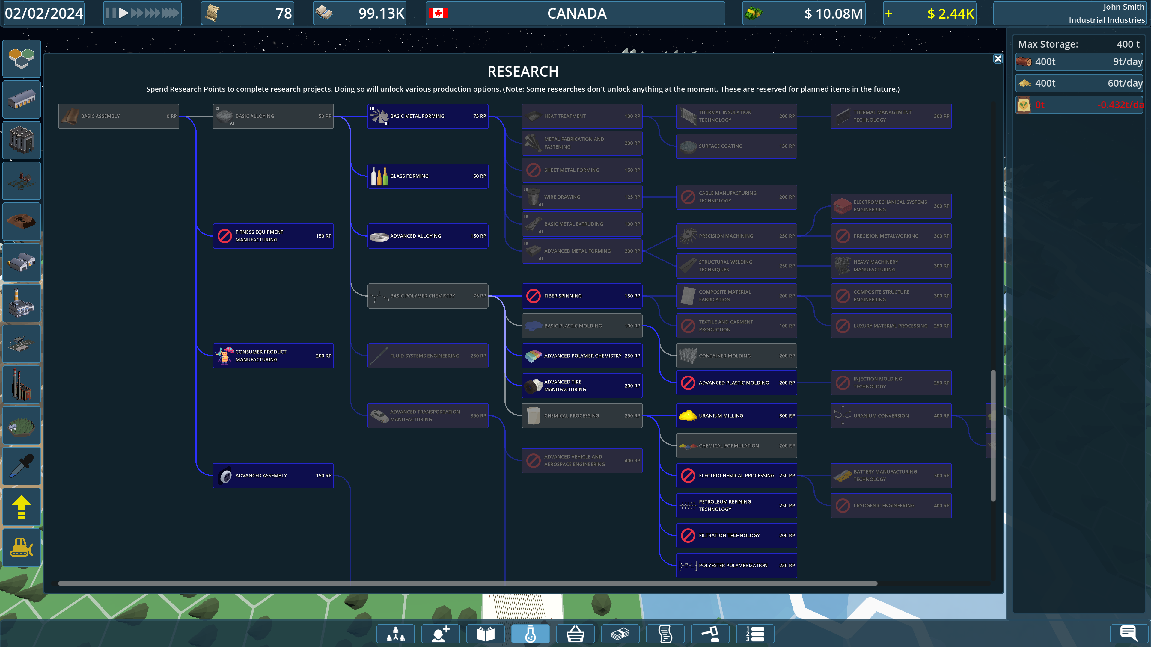 - Research Tree: Unlock new technologies, from commercial fishing techniques to nuclear power.