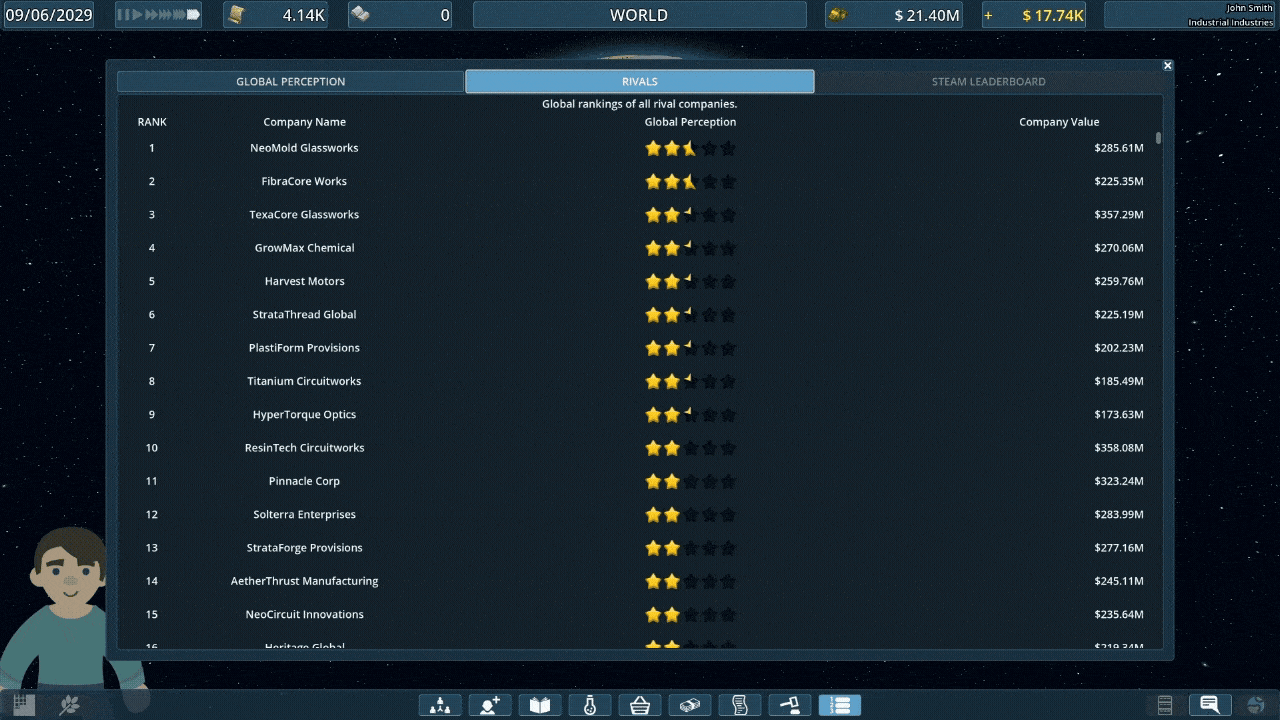 Hello! Beginning in 0.0.6.0 your company will be rated a number of stars based on several aspects of how your company is run. From outstanding debt, and cash on hand, to research completed, and curren...